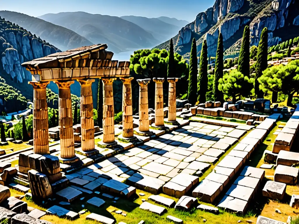 Ruinas antiguas del Templo de Apolo en Delfos, con inscripciones y naturaleza exuberante