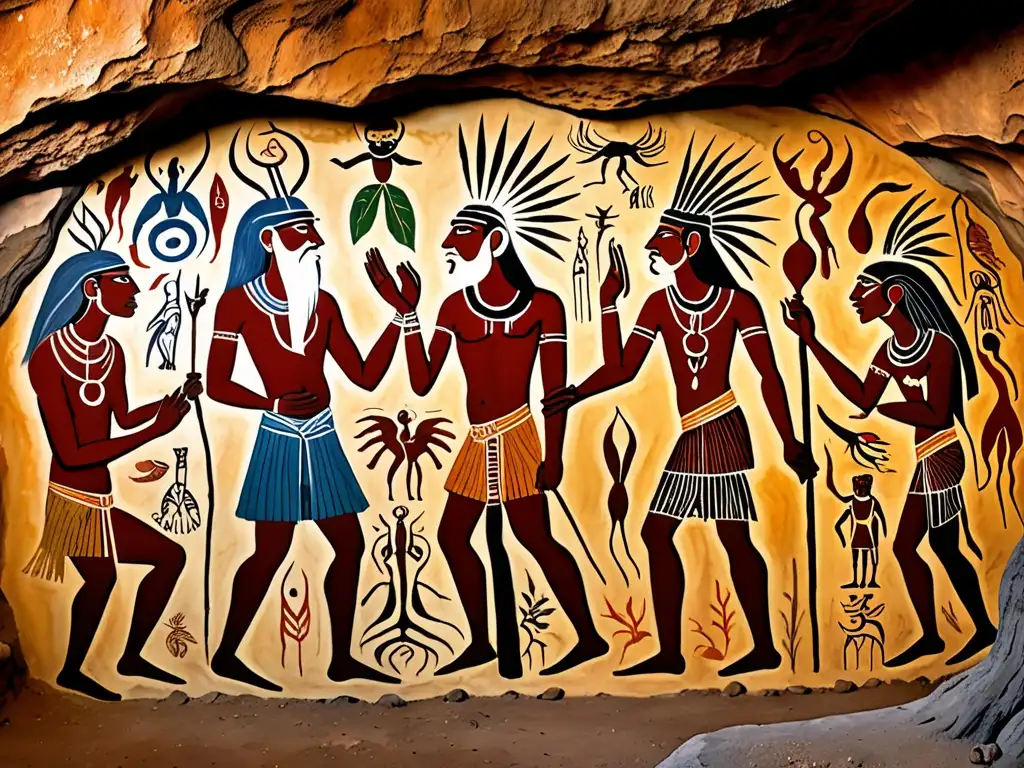 Una impactante pintura rupestre muestra arquetipos junguianos y leyendas mundiales en una escena mítica llena de color y misterio